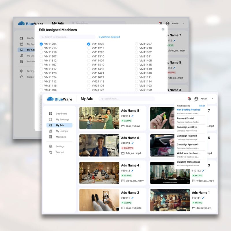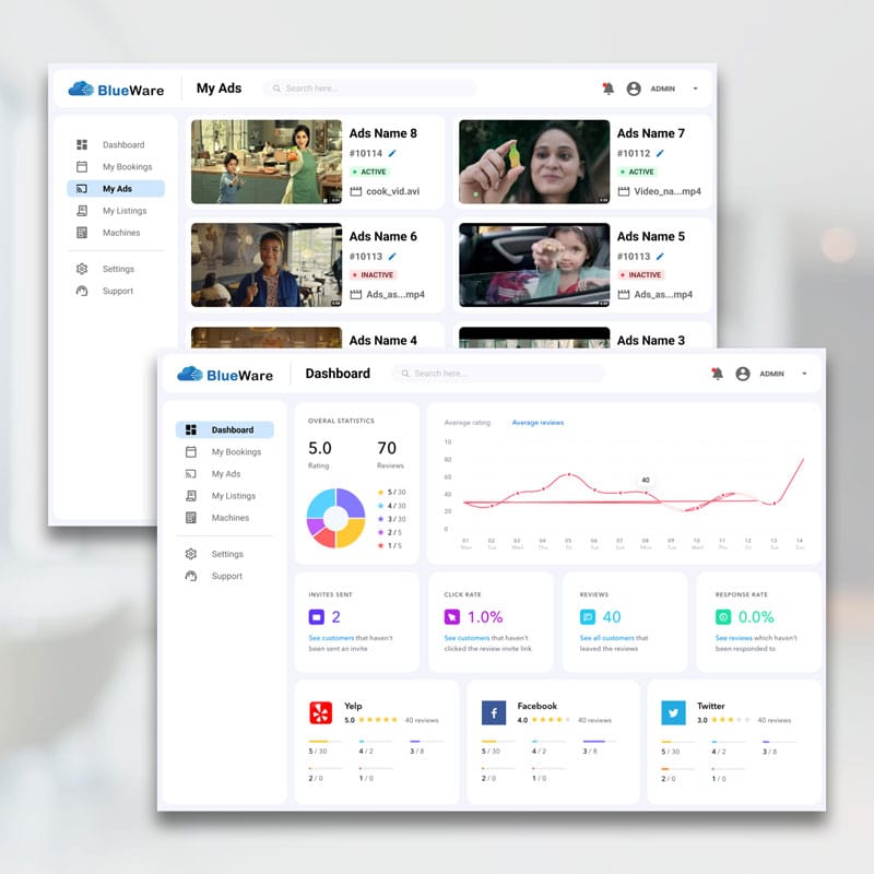 The BlueWare AD+ platform enables business owners/operators to control the content of their advertisements in real-time, including the number of advertisements, advertisement duration, and priority of airtime, through the AD+ admin portal.